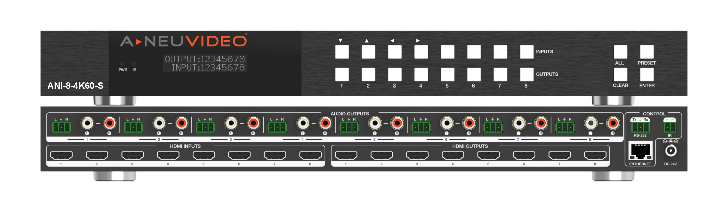 In addition to supporting 8x8 HDMI, the ANI-8-4K60-S supports Independent 8x8 audio matrix routing, in which you can route the incoming audio from any HDMI source to Analog Audio Outputs (audio remains embedded on the HDMI).