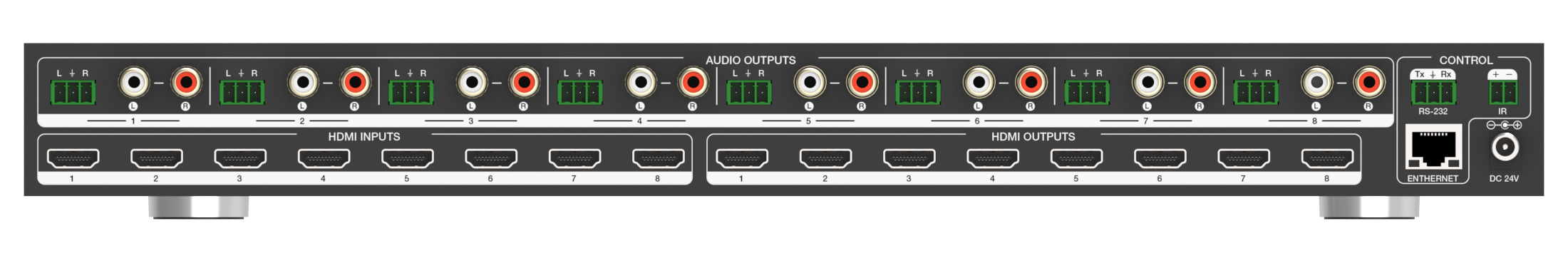 - Independent 8x8 audio matrix, in which you can route the incoming audio from any HDMI Input to any Analog Audio Output